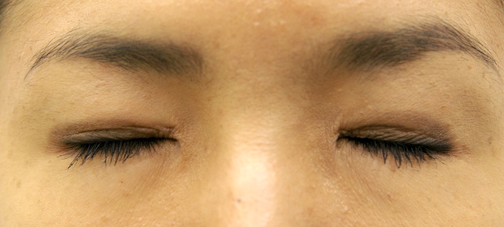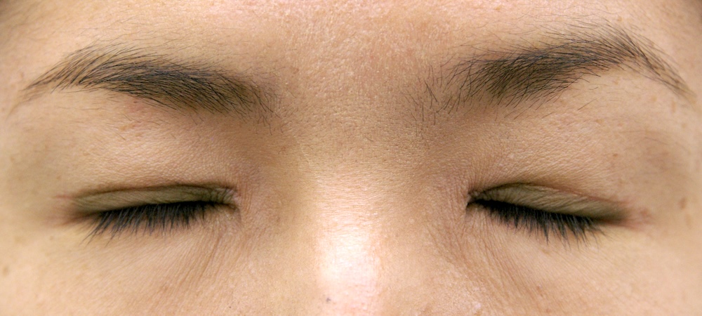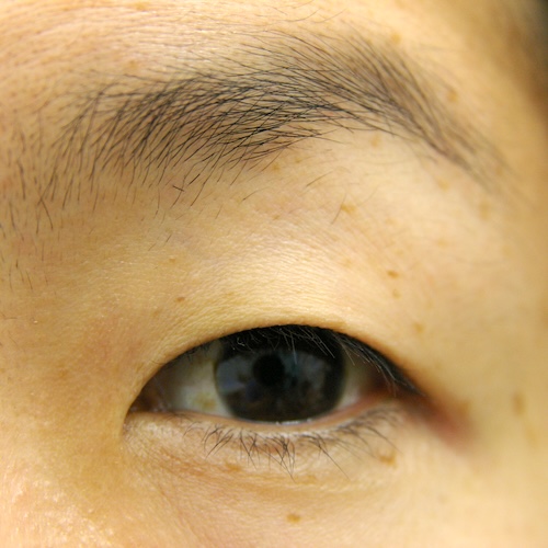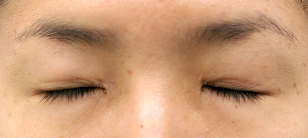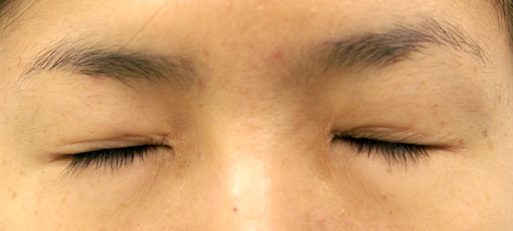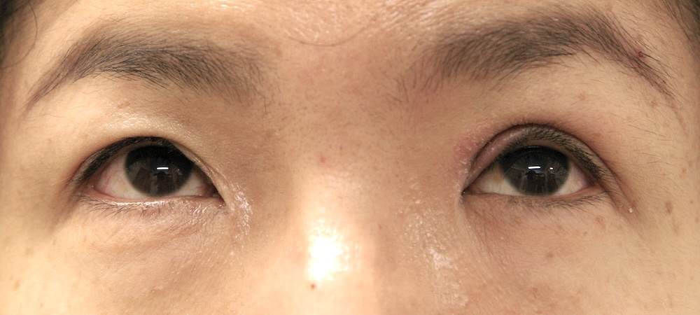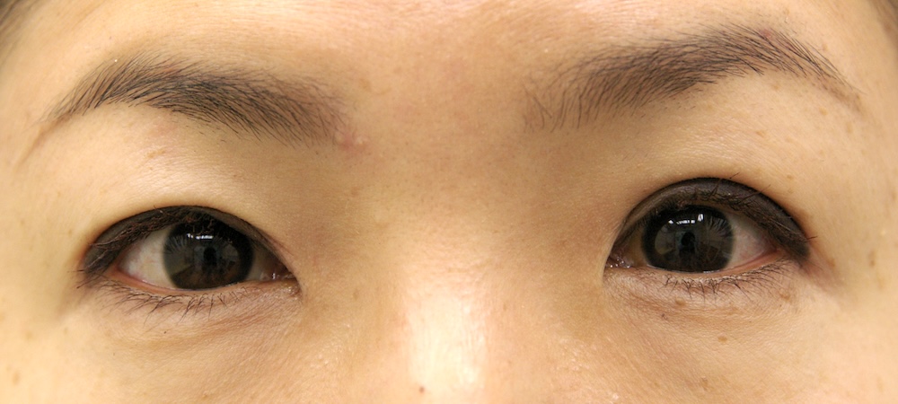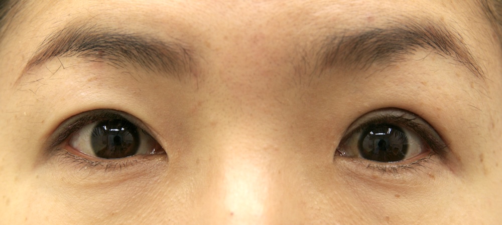 眼瞼下垂症に関しては特に問題なく経過し、眉の左右差もほぼ無くなり快適にお過ごしだったようです。突然生じた左目頭のかぶれに対しては塗り薬と内服薬で治療し、しばらくして全快されました。予想通り右側の皮膚が少し被ってきていましたが、今のところ支障なく切り取る希望もないとのことでした。左側はかぶれているため腫れていて重瞼幅がやや広く見え、傷跡も目立っていますが、皮膚炎が回復するのと並行して柔らかくなっていきました。