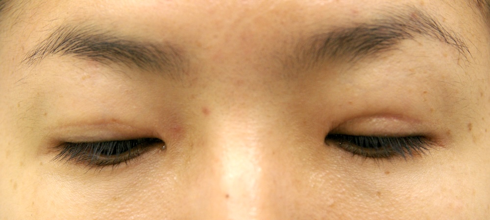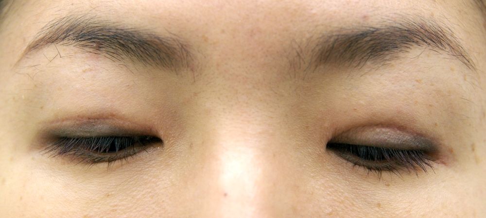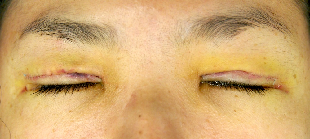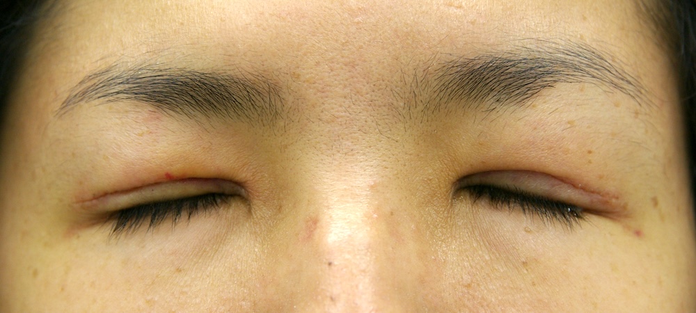 まだ切開した傷跡ははっきり見え、目をしっかり閉じると目頭に皺がよります。