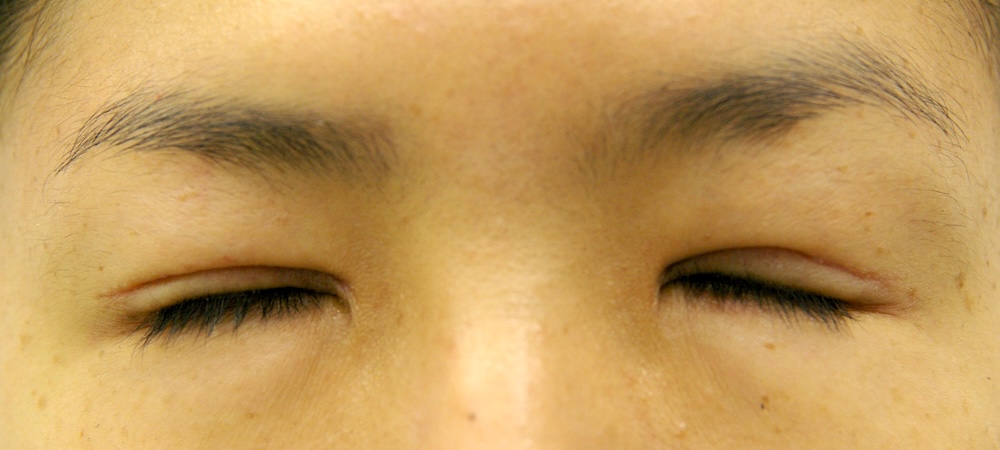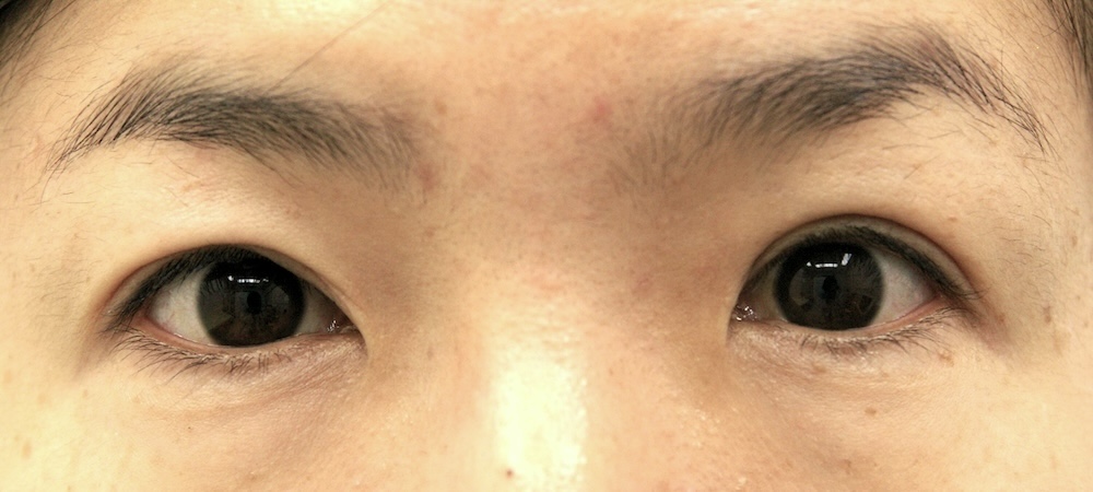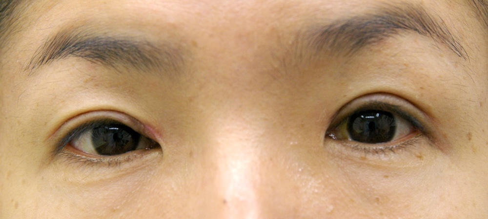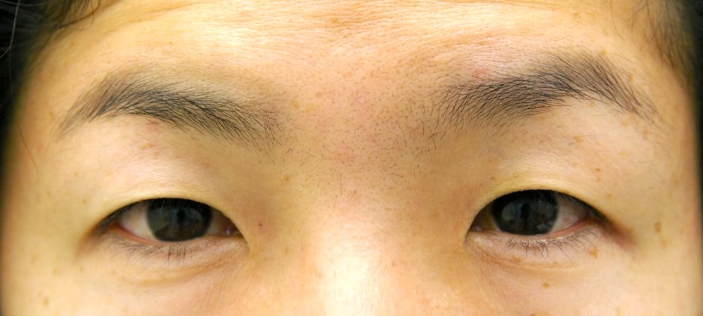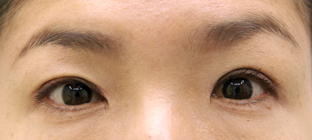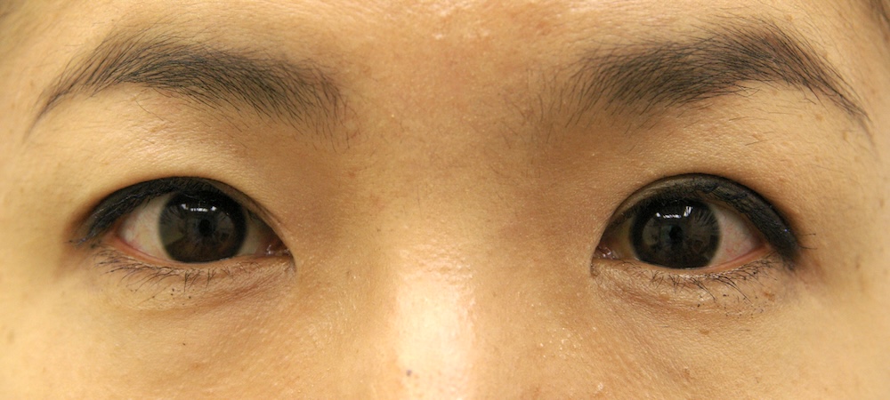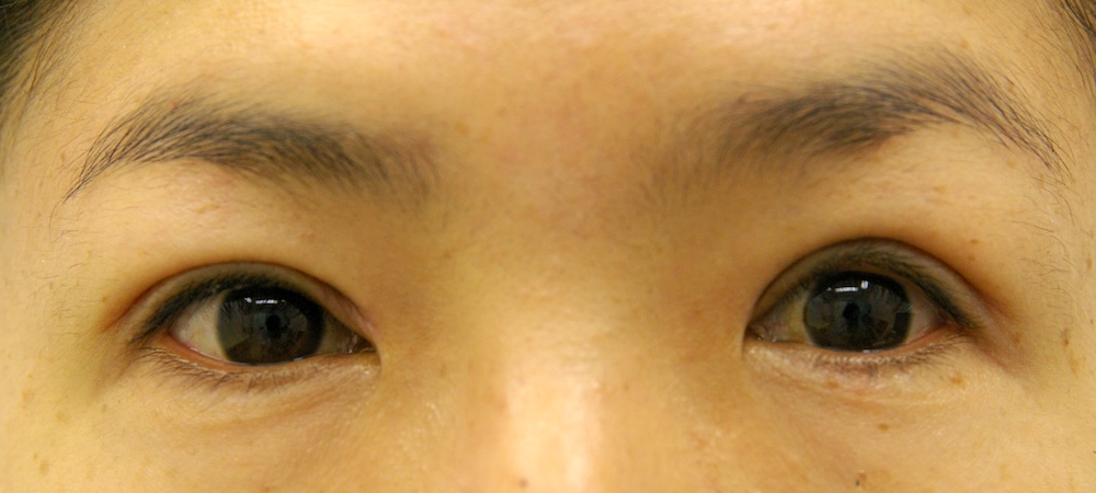 コメント: 一重瞼の患者さんは瞼(縁)は下がっておらず、確かに上方視は障害されているとはいえ、瞼の動きそのものには異常がないので、眼瞼挙筋前転法で手術する必要はなく、普通の重瞼手術(埋没法でも切開法でも)で症状は改善するはずです。しかしこの患者さんの場合、挙筋機能の低下が見られ単純な一重瞼とは言えないようでした。