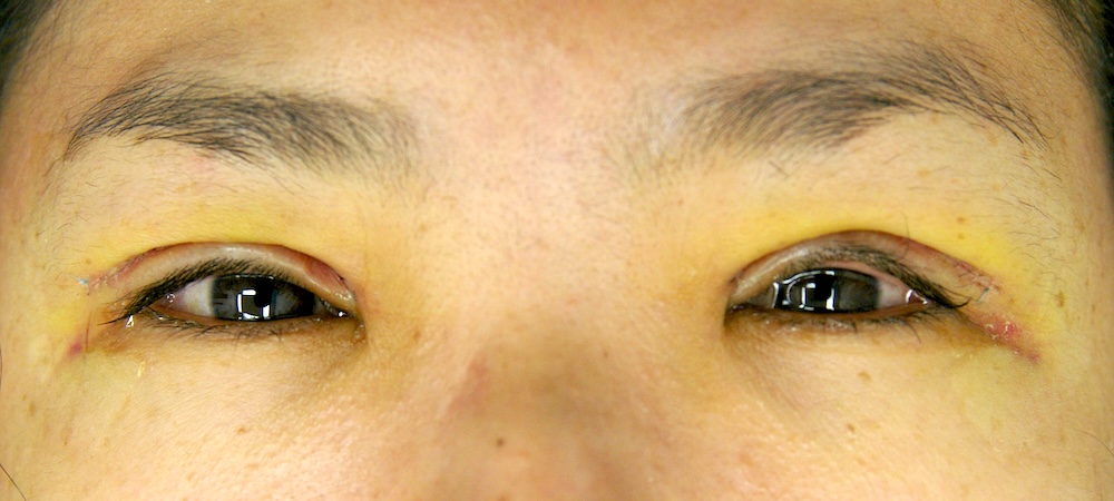 翌日に再診してガーゼを外してもやはり瞼はほとんど開きません。ご本人は瞼が突っ張っている感じがすると言います。内心困りましたが、腫れがひけば開いてくる筈と信じてこのまま様子を見ることにします。