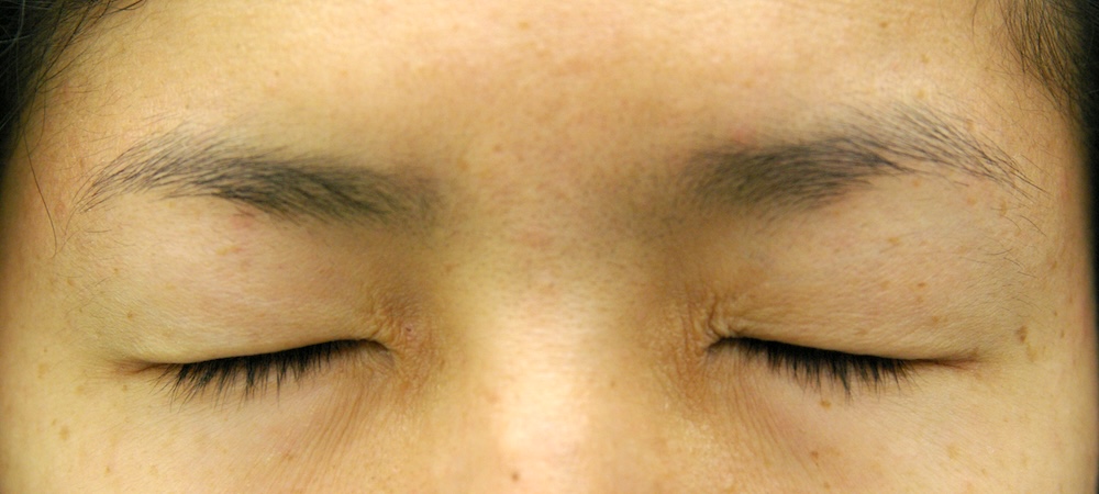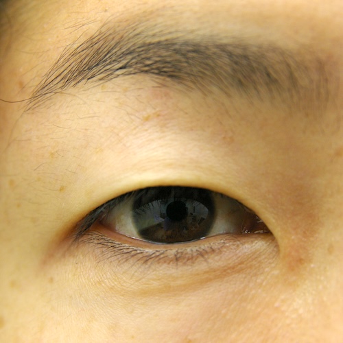 瞼裂やや狭小ですが、眼瞼縮小症候群の特徴である逆内眼角贅皮は見られず程度も軽いので病的なものではなさそうです。下垂も軽度でごく普通の一重瞼と言えなくもないのですが、挙筋機能がうまく計れず眉を上げないと上方視できないことから、先天性の素因もあるのではないかと思いました。視力は左右差がありますが正常範囲で、悪い方の眉挙上が見られます。