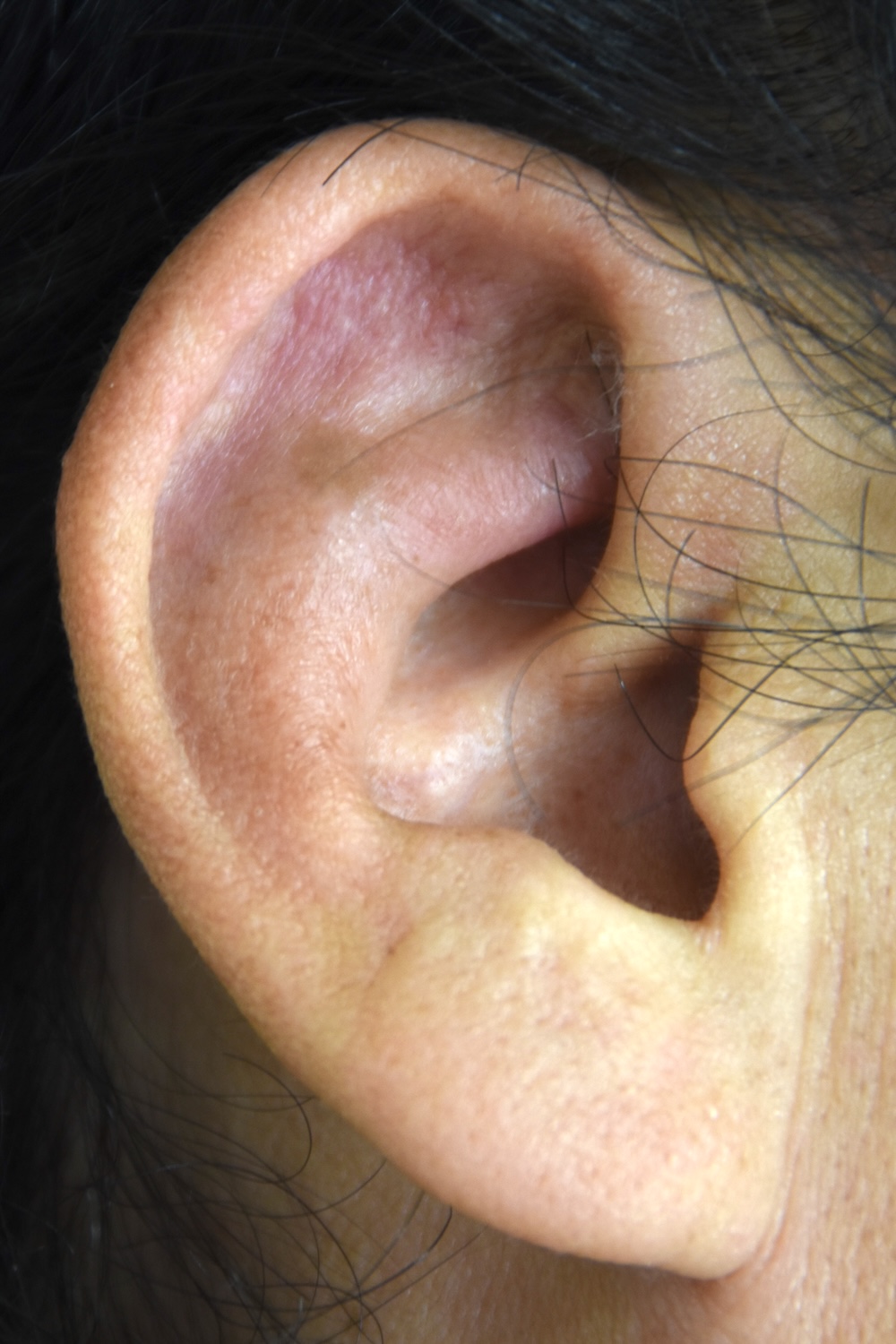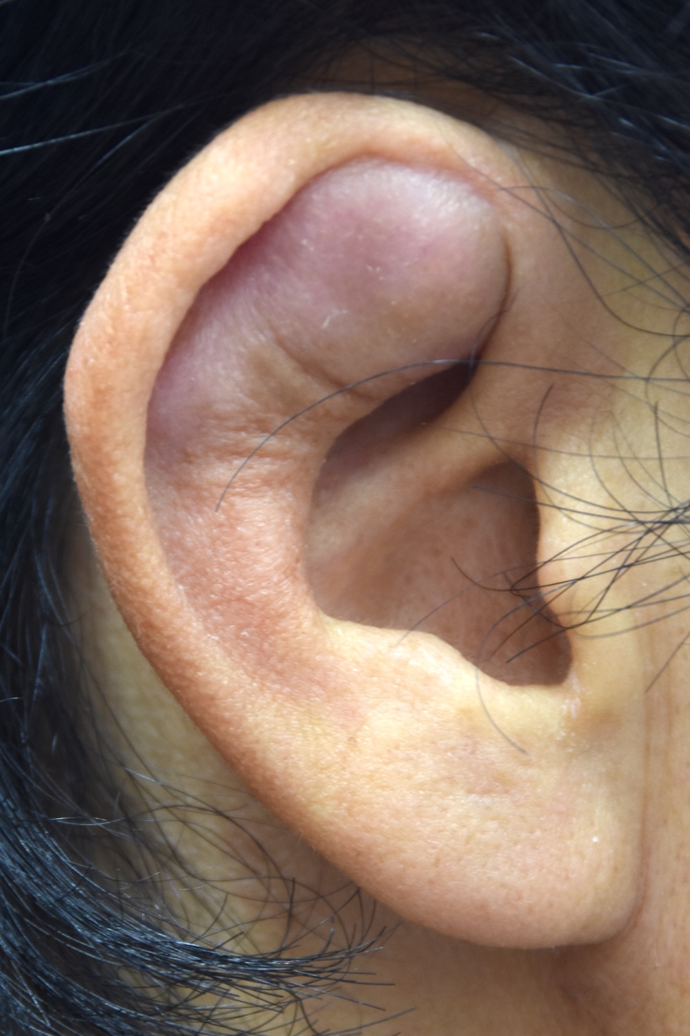 上左で見たのと同じ症例です。一部を強く曲げたために耳輪が波打っています。
