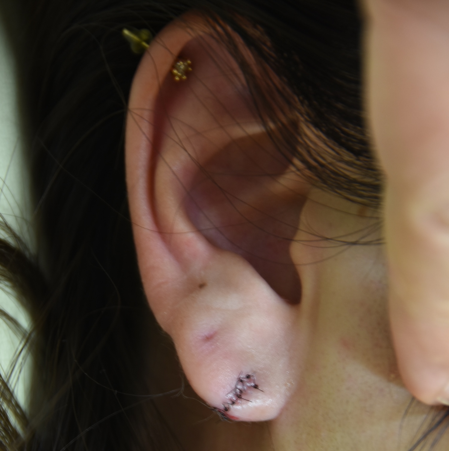 表裏を同じ方向に塞ぐと耳たぶが変形を起こして四角くなったり尖ったりするので、丸みを帯びて治るように縫合方向を工夫します。